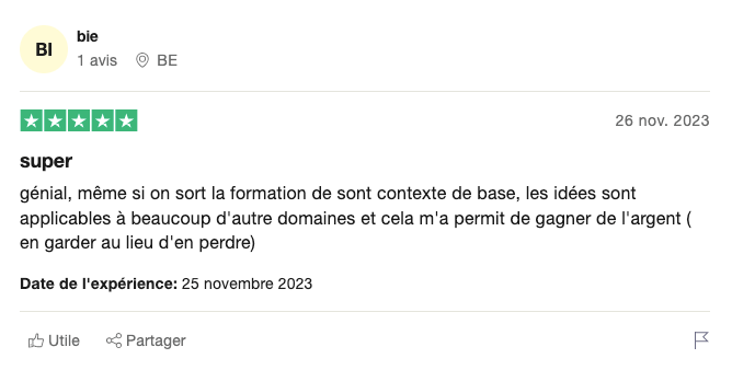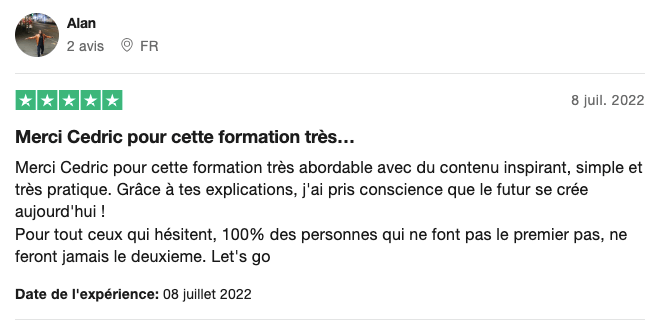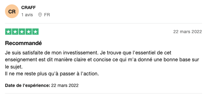 Ce n’est pas une formation du style « Devenez riche dès demain sans faire d’effort ». C’est une formation du style « Devenez riche à coup sûr en acquérant une nouvelle compétence clé, et en générant une nouvelle source de revenus qui va tomber dans les prochaines semaines »… Devenir riche rapidement sans effort, ça n’existe pas. Il n’y a que dans le dictionnaire que le mot succès arrive avant travail. Le jeu en vaut vraiment la chandelle. Vous allez acquérir de nouvelles compétences qui sur le moyen/long terme vont vous rémunérer à vie.